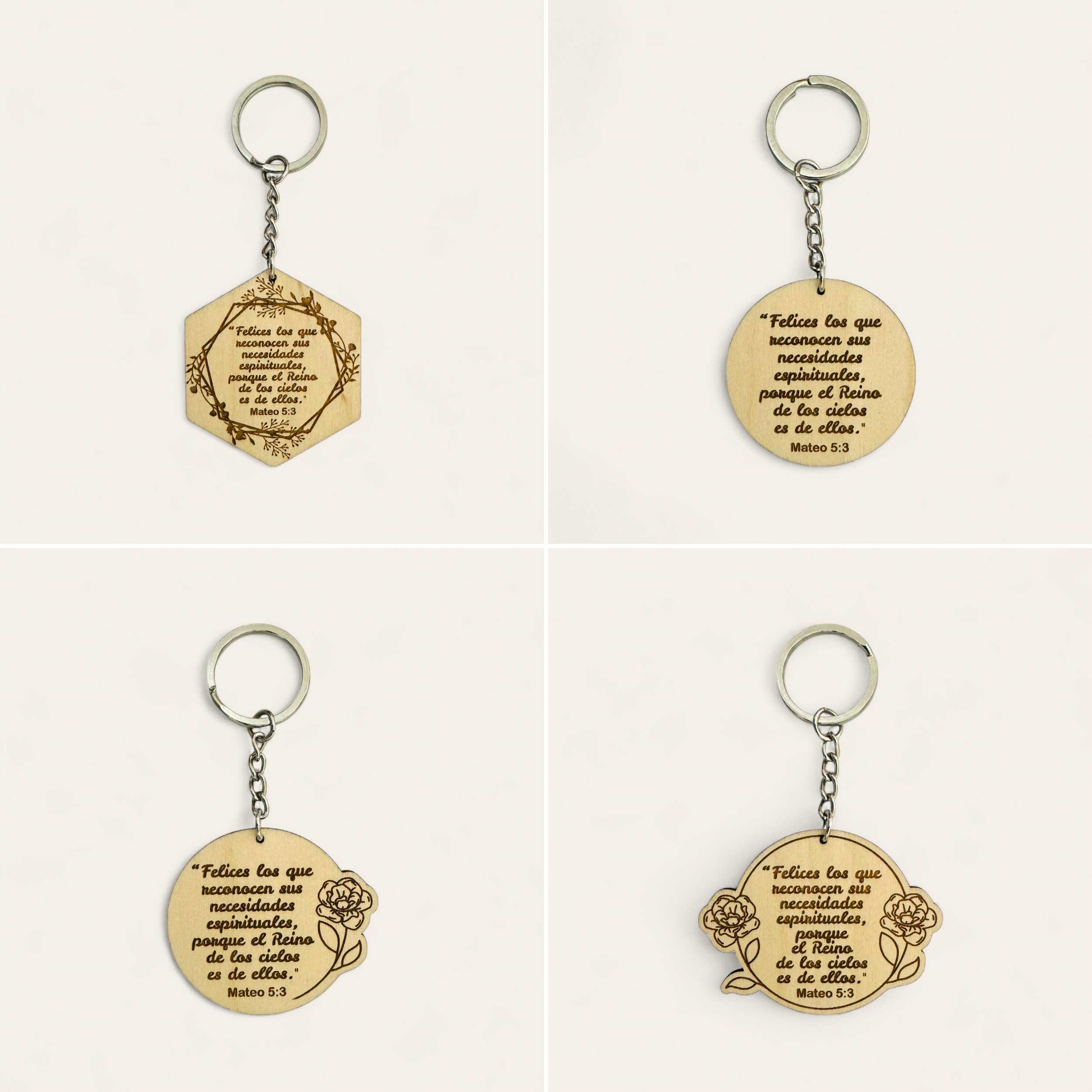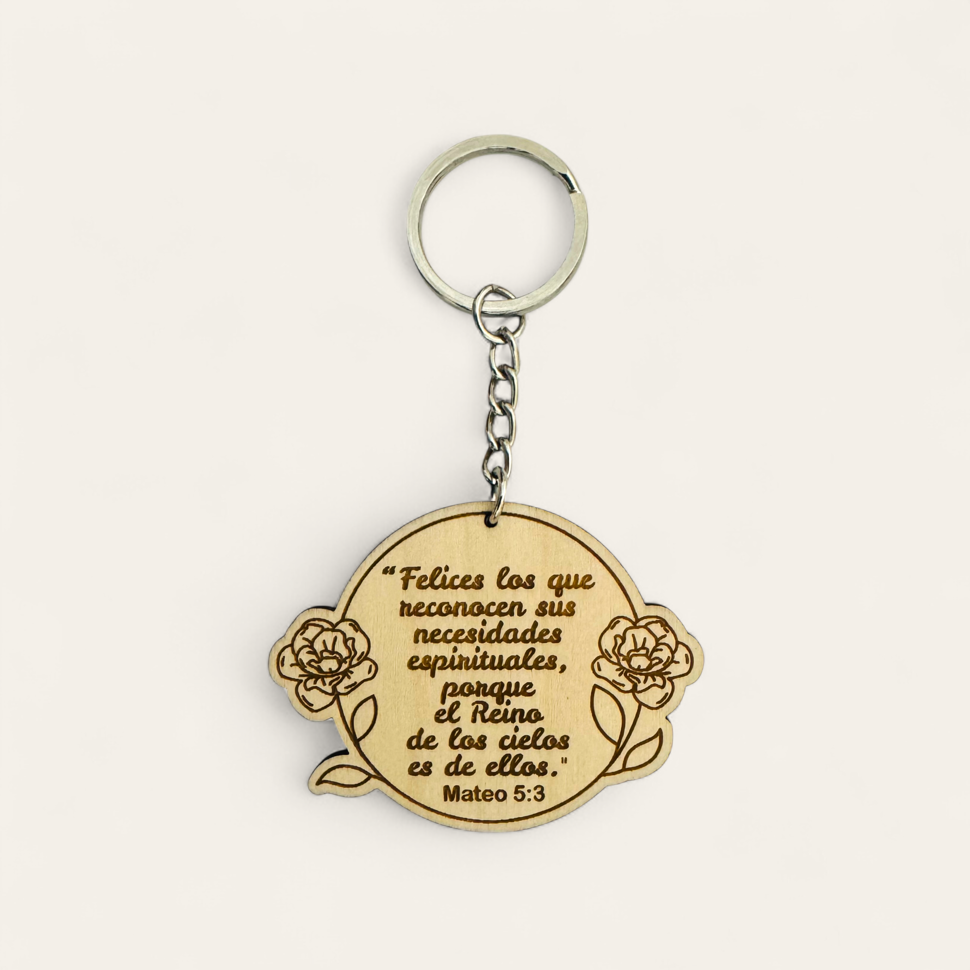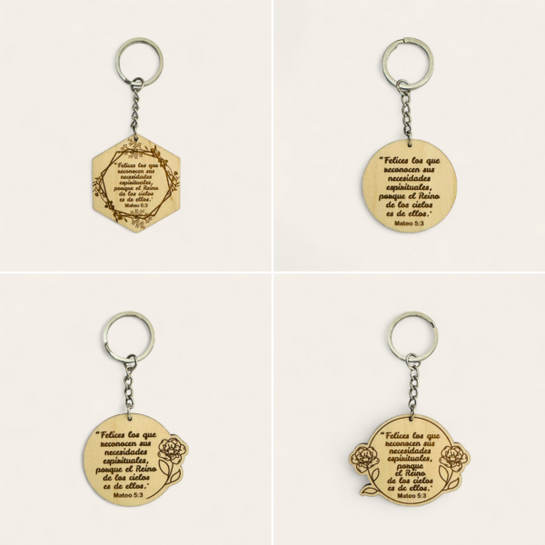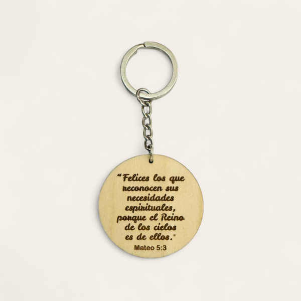 Explora la elegancia en miniatura con nuestro llavero de madera grabado con láser con el texto del año 2026: “Felices los que reconocen sus necesidades espirituales, porque el Reino de los cielos es de ellos.” (Mateo 5:3).